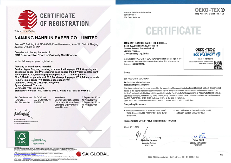 Subtextile actively follows international trends, responds to national policies, and regards sustainable development as the most basic value of the company. All our sublimation printing materials are non-toxic and environmentally friendly, and our sublimation paper and sublimation ink have obtained FSC certificate and OEKO-TEX certificate respectively.