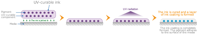 The color components of the ink are directly cured and adhered to the media or substrate by UV radiation, and the ink emits very low levels of VOC (volatile organic carbon). The LED (light-emitting diode) light does not radiate short wavelengths that generate ozone. Use of Mimaki UV-curable ink demonstrates consciousness about the environment and the health of users.