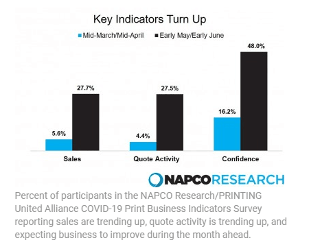 A commercial printer reports, “Our sales started dropping on March 13. We hit bottom on April 9. We bounced along the bottom until May 11, when order writing came off the bottom at an increasing rate. It’s impossible to declare a long-term trend from this small data set.”
