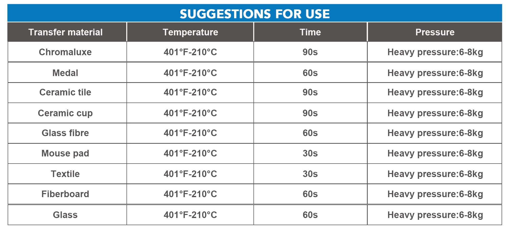 For all goods, a temperature of 400° F is advised. Close your heat press with moderate to strong pressure—it should take some effort. Depending on your heat-press and the thickness of the blank material, time and temperature may vary. Increase or decrease dwell periods in 5-10 second increments until you find the time that produces the clearest image.